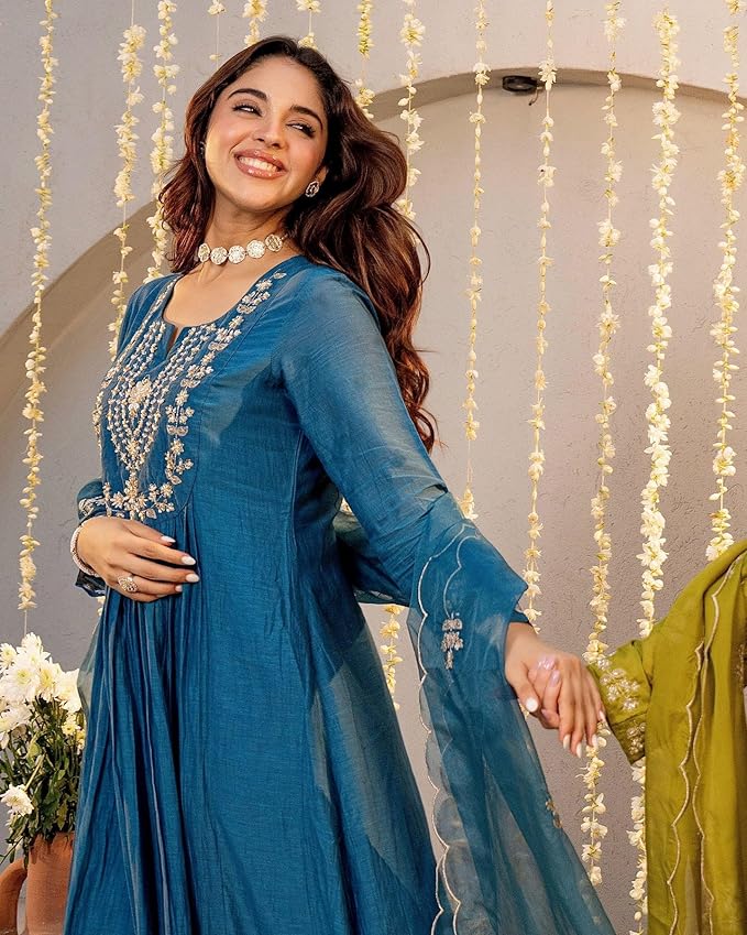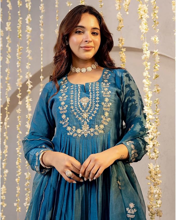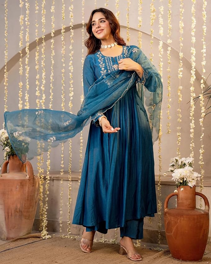 • Product Material:- Viscose Silk | Colour:- Multicolored | Pattern :- Solid & Embroidery | Dupatta :- Chanderi Cotton | Style:- Anarkali Kurta | Sleeve Length:- 3/4 Sleeve | Bottom:- Pant Includes a coordinated Anarkali kurta, ankle-length pants, and a stunning printed dupatta, offering a complete traditional look with minimal styling effort.