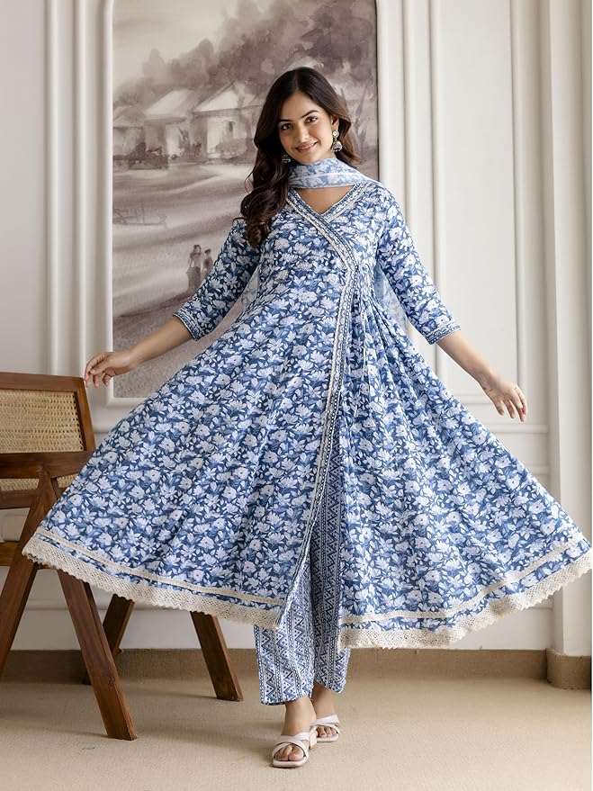 - Style: Angrakha-style Anarkali Kurta Pant Dupatta Set || Work: Embroidery Work With Floral Print Design